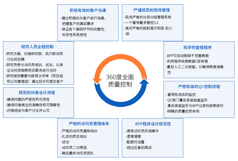蘭德趨勢秉承客觀、專業、高效的服務理念,在各個環節均有嚴格的質量控制體系,堅持360度全面質量管理,并于2008年自主編寫訪問員手冊及督導執行手冊,截止目前進行了三次修訂,更加規范了項目執行流程,確保了數據的真實有效,360度全面質量控制圖如下:
